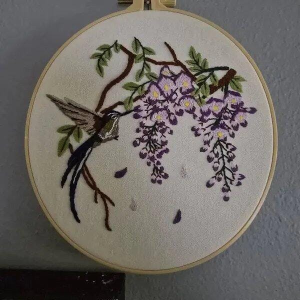 Every stitch brings the scene to life—the gentle cascade of lilac blooms and the delicate poise of the hummingbird in mid-flight.